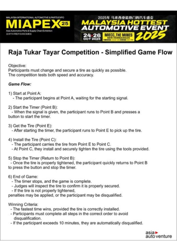- Team Category – Workshop vs Workshop: The stakes are highest here! Workshops will field a 2–3 member team to represent their brand. Teams must change two tires (front & rear) on the same side of the vehicle. The fastest and most accurate team will earn the coveted title of “Raja Tukar Tayar – Workshop Champion.”
