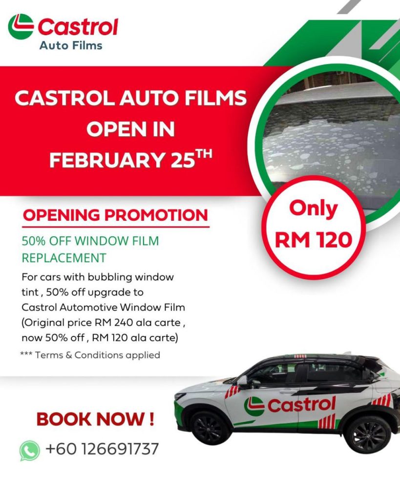 In conjunction with the grand opening, Castrol Auto Films Malaysia has introduced a limited-time promotion aimed at vehicle owners experiencing bubbling or deteriorating window tint.